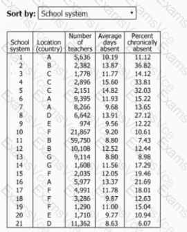 The table gives Information about teacher absenteeism in 21 school systems worldwide for 2012-2013. For each school system, the table gives the country where It Is located, the number of teachers It employed m 2012-2013, the average number of days those teachers were absent, and the percent of those teachers who were chronically absent (absent 18 or more days).