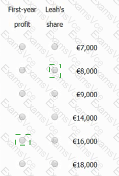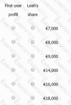 Select for First-year profit and for Leah's stare amounts In euros that are consistent with the given Information and could be the first-year profit of JKL Enterprises and Leah's share of those profits, respectively. Make only two selections, one in each column.