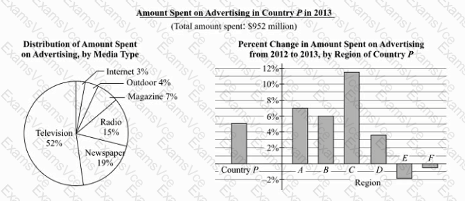 In Country P the percent spent on outdoor advertising in 2012 was one-half of the corresponding percent spent in 2013. Which of the following is closest to the amount spent on outdoor advertising in Country P in 2012 ?