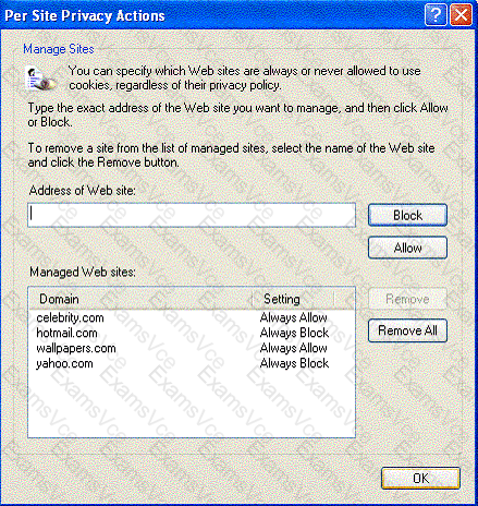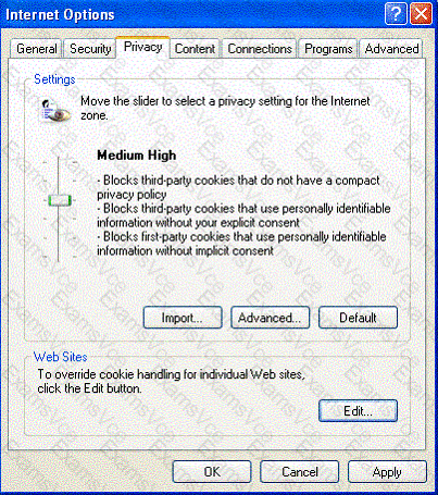 John works as a Website Administrator in ABC Inc. The users of the company always use Internet Explorer for Web browsing. One of the users opens the Privacy tab page in the Internet Options dialog box and configures the privacy settings for the Internet zone as displayed in the following images: