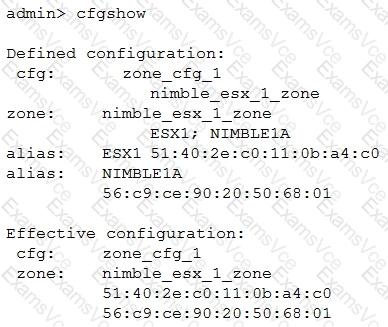 When performing a code upgrade on an HPE Nimble array, you noticed a connection failure on ESX1. Refer to the exhibit showing the complete zoning configuration of one of the HPE SN3000B switches.
