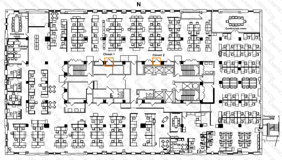 NewStellar has a main corporate campus in a business park with two adjacent buildings. Each building has three floors and each floor is 322 x 175 feet (98 x 53 meters) for 56,350 square feet (5,235 square meters) total. The ceiling for each floor is 12 feet (3.6 meters) high with a drop-down ceiling at 10 feet (3 meters). The network architect has given you one floor to analyze, Building 1 Floor 2, shown in the attached exhibit.