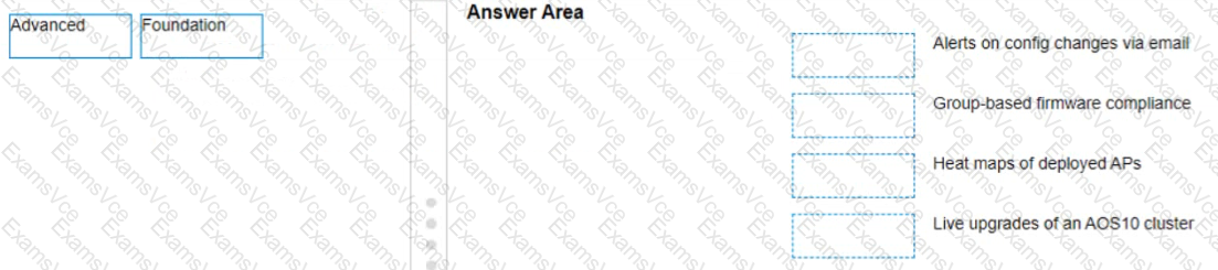 A network administrator with existing IAP-315 access points is interested in Aruba Central and needs to know which license is required for specific features Please match the required license per feature (Matches may be used more than once.)