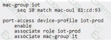 The test device needs to be assigned the "lot-prod'' role, in addition the "lot-default" role must be applied for any other device connected lo interface 1/1/1. This is a lab environment with no configuration of any external authentication server for the test.