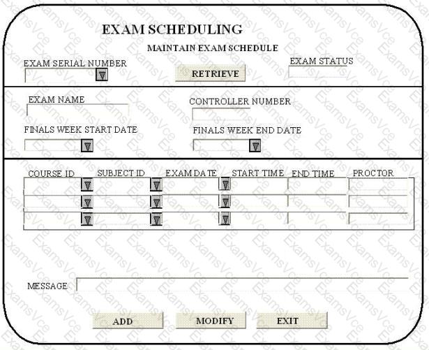 The controller uses a screen to schedule exams for various courses and subjects. The exam serial number from the University Master logical file, maintained by the University Master Information application, is entered in the screen. On pressing the RETRIEVE key, the exam status, exam name, controller number, finals week start date and finals week end date are displayed.