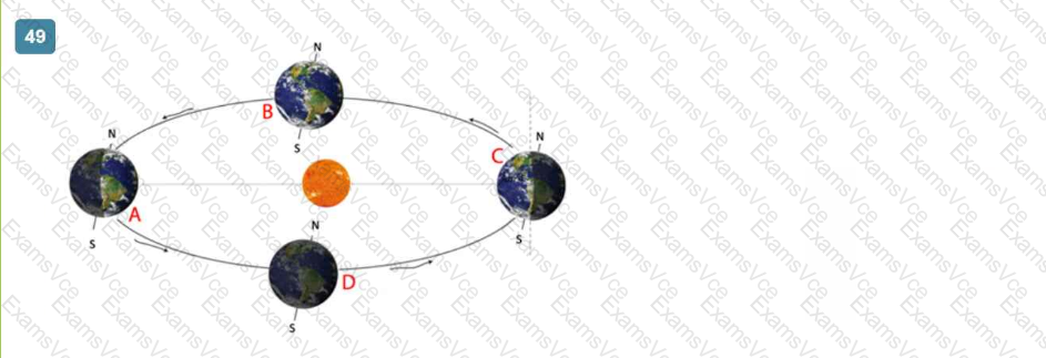 Which point in the diagram represents Earth's location at the time of year when the United States experiences the most direct sunlight?