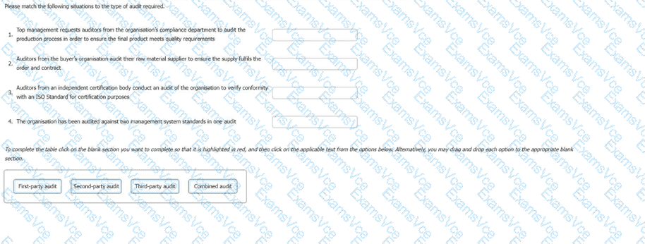 Auditors from the buyer’s organisation audit their raw material supplier to ensure the supply fulfils the order and contract = Second-party audit