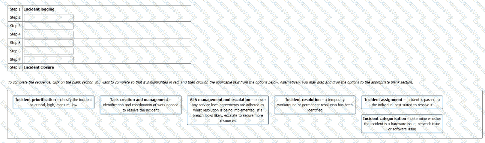 Step 1 = Incident logging Step 2 = Incident categorisation Step 3 = Incident prioritisation Step 4 = Incident assignment Step 5 = Task creation and management Step 6 = SLA management and escalation Step 7 = Incident resolution Step 8 = Incident closure