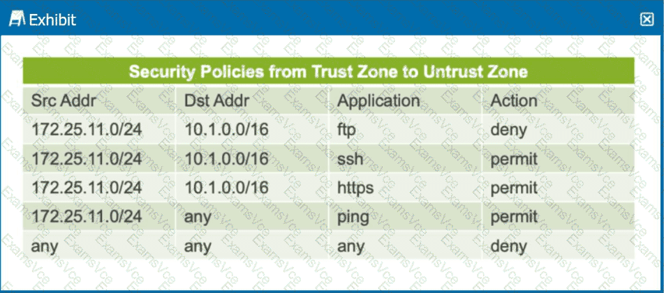 The exhibit shows a table representing security policies from the trust zone to the untrust zone.