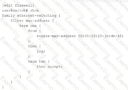 Term one logs traffic from a specific source MAC address 88:05:00:29:3c:de/48 . The log action is a nonterminating action, which means that the device continues to evaluate the packet against the remaining terms in the filter 2 . Therefore, traffic that matches the from statement in term one is not discarded, and option A is incorrect.