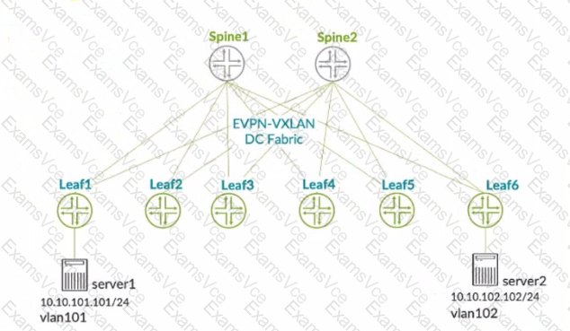 You connect two single-homed servers using Juniper Apstra as shown in the exhibit. You are using the ERB design blueprint with two virtual networks in a common routing zone.