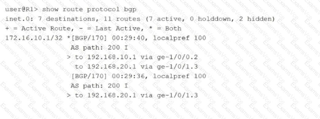 Multipath Parameter (Option B): The routing table shows two distinct paths for the prefix 172.16.10.1/32. The first path has two next hops (192.168.10.1 and 192.168.20.1) and is marked with the plus symbol (+) and the asterisk (*), indicating it is both an active and the best route. The presence of multiple next hops being used simultaneously for a single BGP path is a clear indication that the multipath parameter is enabled in the BGP configuration. In Junos OS, BGP multipath allows the installation of multiple equal-cost BGP paths into the forwarding table to facilitate load balancing.
