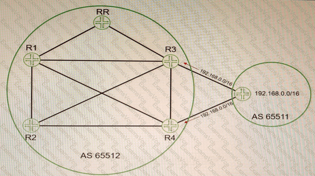 Referring to the exhibit, you are receiving the 192.168 0 0/16 route on both R3 and R4 from your EBGP neighbor You must ensure that R1 and R2 receive both BGP routes from the route reflector