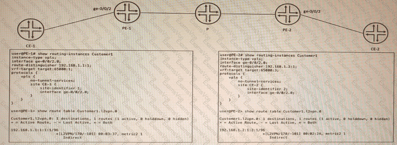 CE-1 and CE-2 are part of a VPLS called Customer1 No connectivity exists between CE-1 and CE-2. In the process of troubleshooting, you notice PE-1 is not learning any routes for this VPLS from PE-2, and PE-2 is not learning any routes for this VPLS from PE-1.