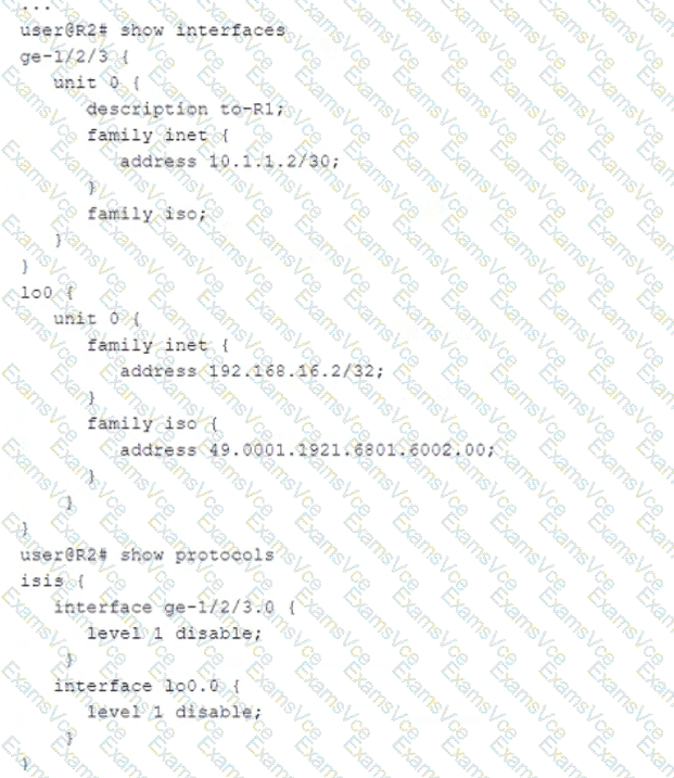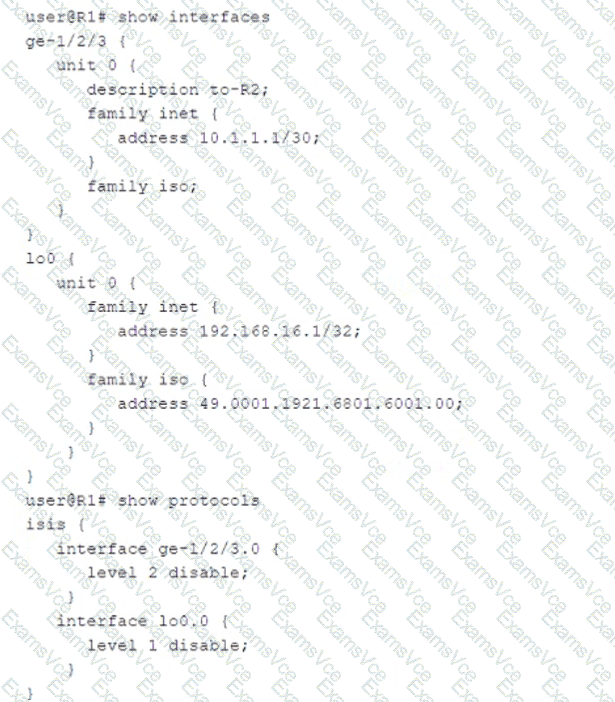 Referring to the exhibit, what must be changed to establish a Level 1 adjacency between routers R1 and R2?