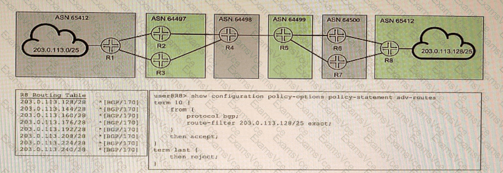 You are attempting to summarize routes from the 203.0.113.128/25 IP block on R8 to AS 64500. You implement the export policy shown in the exhibit and all routes from the routing table stop being advertised.