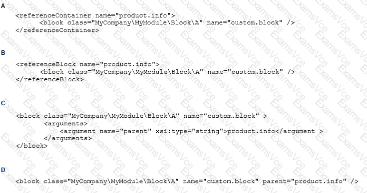 How do you set the custom block MyCompany\MyModule\Block\A as a child for the block named product.info using layout XML?
