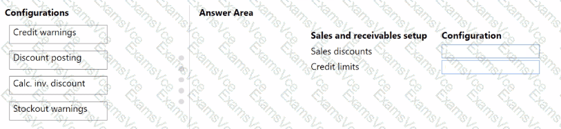 What should you configure for each setup area? To answer, drag the appropriate configurations to the correct sales and receivables setup. Each configuration may be used once, more than once, or not at all. You may need to drag the split bar between panes or scroll to view content.