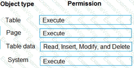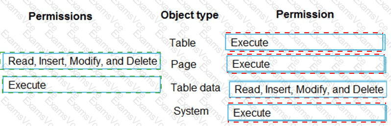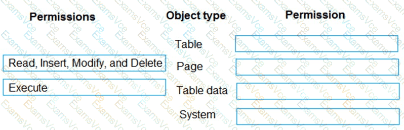 Which permission or set of permissions is allowed for each type of object? To answer, drag the appropriate permissions to the correct object types. Each permission set may be used once, more than once, or not at all. You may need to drag the split bar between panes or scroll to view content.
