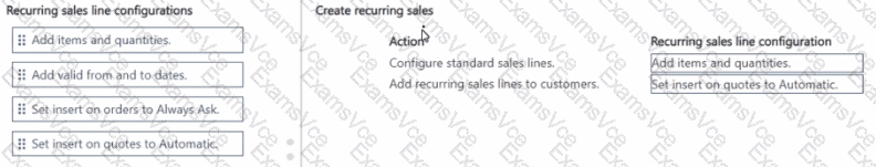 How should you complete each action? To answer, move the appropriate recurring sales line configurations to the correct actions. You may use each recurring sales line configuration once, more than once, or not at all. You may need to move the split bar between panes or scroll to view content.