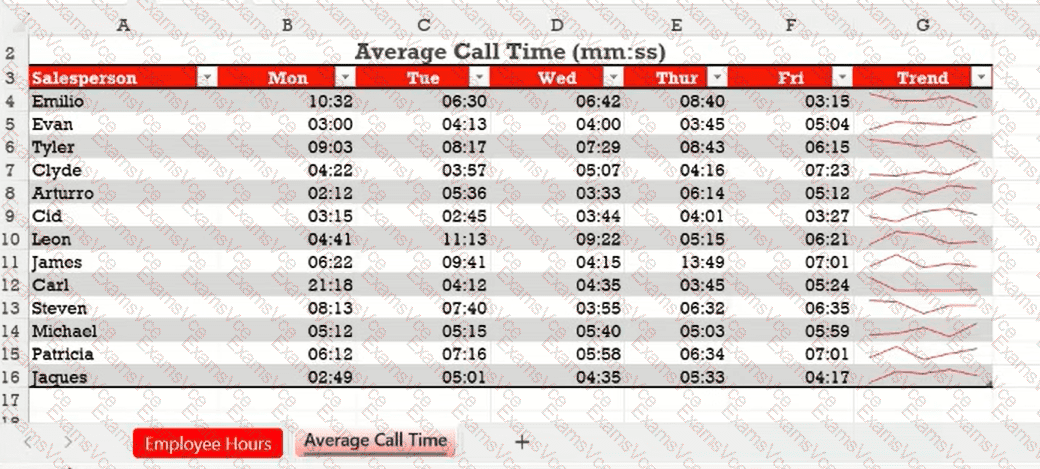 On the Average Call Time worksheet, use an Excel feature to copy the sparkline into all the vacant cells of the Trend column.