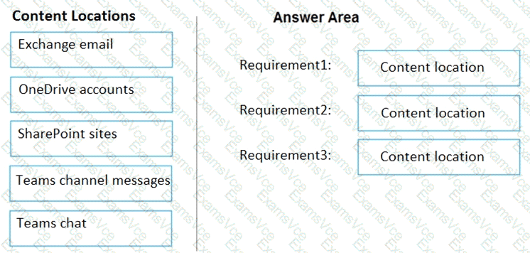 Which content location should you include in the retention policies? To answer, drag the appropriate content locations to the correct requirements. Each content location may be used once, more than once, or not at all. You may need to drag the split bar between panes or scroll to view content.