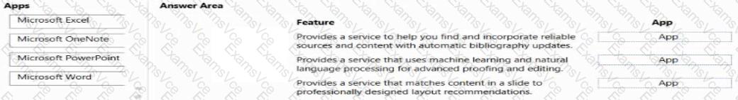 Which Microsoft 365 Apps apps should you use? To answer, drag. the appropriate apps to the correct features. Each app may be used once, more than once, or not at all. You may need to drag the split bar between panes or scroll to view content.