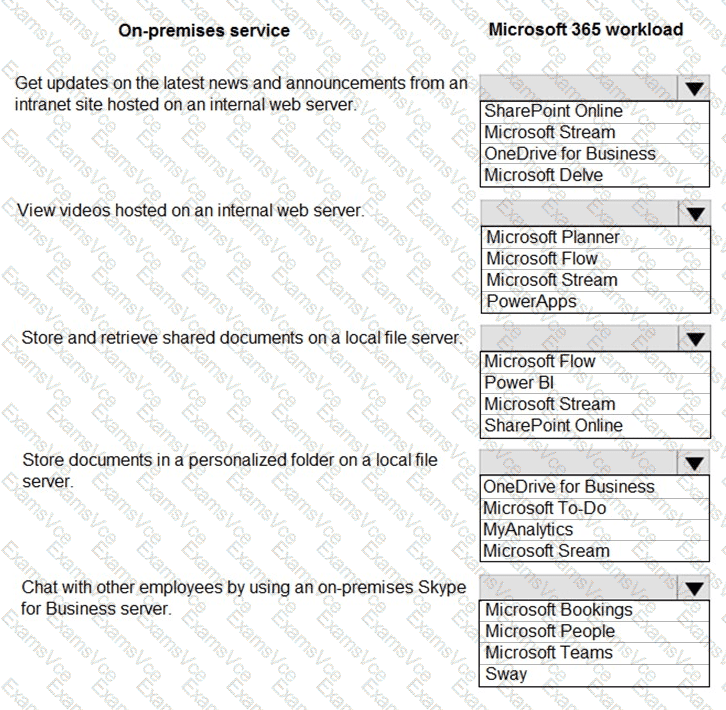 You need to determine which Microsoft 365 workload is appropriate to replace each on-premises service.