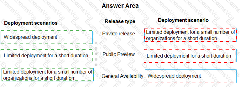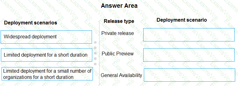 Match each deployment scenario appropriaterelease type. To answer, drag the appropriate deployment scenarios to the correct release types. Each deployment scenario may be used once, more than once, or not at all. You may need to drag the split bar between panes or scroll to view content.