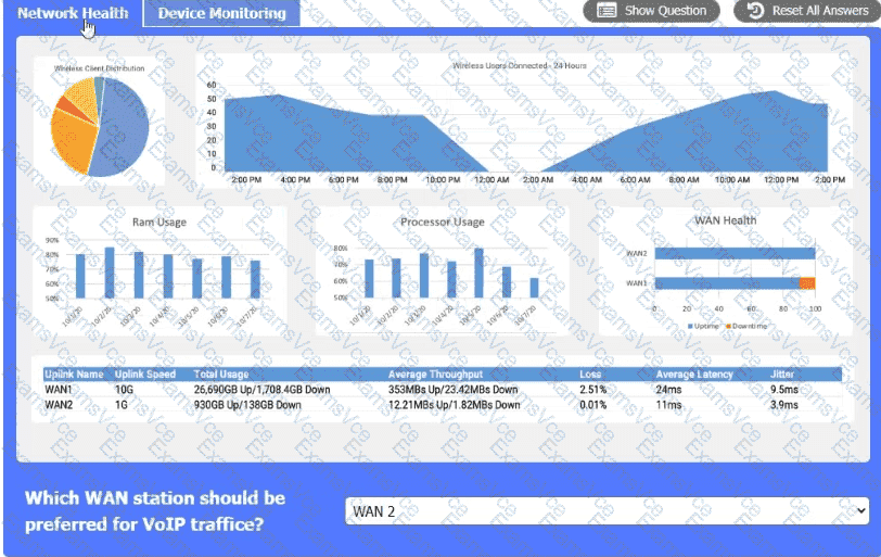 WAN 2 appears to have a lower average latency and loss percentage, which would make it the preferred WAN station for VoIP traffic. VoIP traffic requires low latency and packet loss to ensure good voice quality and reliability. WAN 1 seems to have higher RAM and processor usage, which could also affect the performance of VoIP traffic.