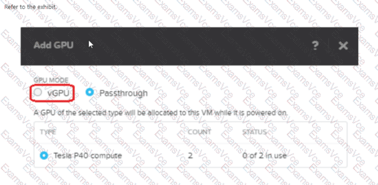 An administrator is configuring a virtual desktop gold master image with P40 NVIDIA vGPU. upon trying to add a vCPU assignment in Prism Element, the administrator noticed that it is not selectable and cannot proceed.