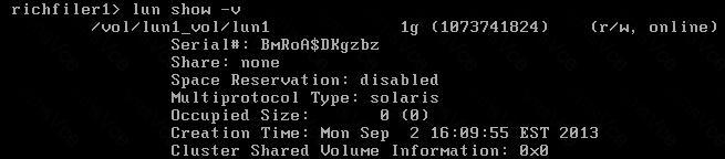 Displays the status (lun_path, size, online/offline state, shared state) of the given LUN or class of LUNs. With the -v option supplied, additional information (comment string, serial number, LUN mapping, HA Pair Shared Volume Information) is also displayed. With the -m option supplied, information about lun_path to initiator_group mappings is displayed in a table format. With the -c option supplied, information about LUN cloning status is displayed.