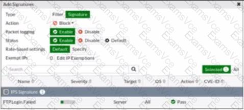 Review the Intrusion Prevention System (IPS) profile signature settings. Which statement is correct in adding the FTP.Login.Failed signature to the IPS sensor profile?