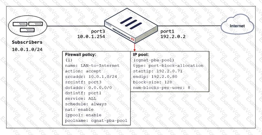 The exhibit shows a diagram of a FortiGate device connected to the network and the firewall policy and IP pool configuration on the FortiGate device.