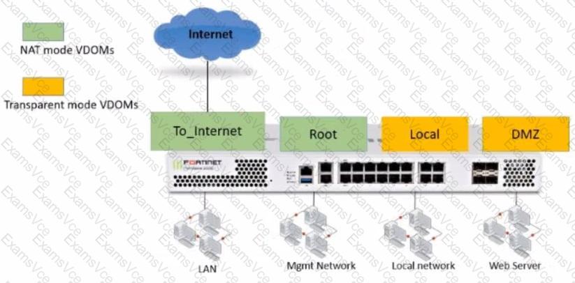 The Root and To_Internet VDOMs are configured in NAT mode. The DMZ and Local VDOMs are configured in transparent mode.