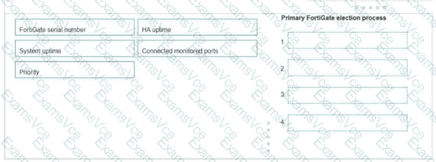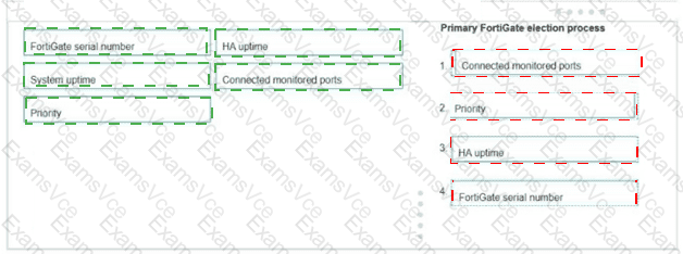 Because override is enabled , the election order changes from the default sequence. The first criterion is still Connected monitored ports , because interface health is evaluated first. After that, Priority moves ahead of HA uptime . If those still do not decide the winner, FortiGate uses the serial number as the final tie-breaker. Therefore the correct order is: