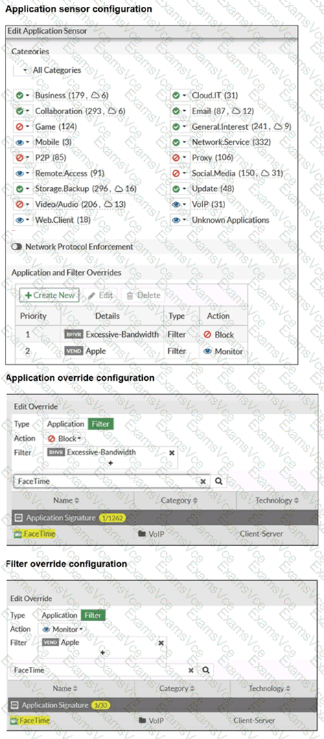 The exhibits show the application sensor configuration and the Excessive-Bandwidth and Apple filter details. Based on the configuration, what will happen to Apple FaceTime if there are only a few calls originating or incoming? (Choose one answer)