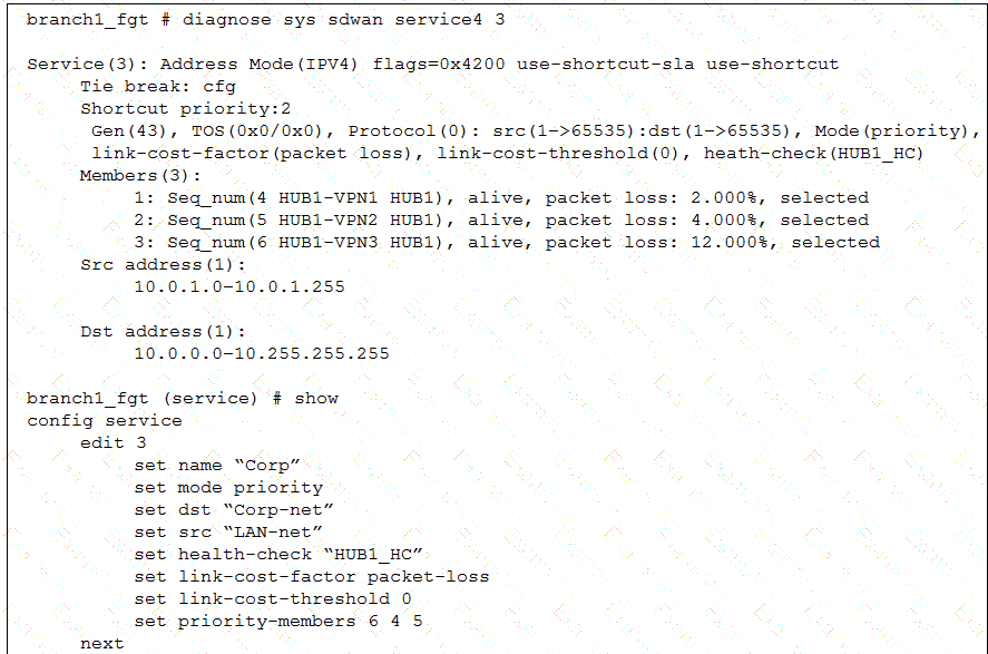 Based on the exhibit, which change in the measured packet loss will make HUB1-VPN3 the new preferred member? (Choose one answer)
