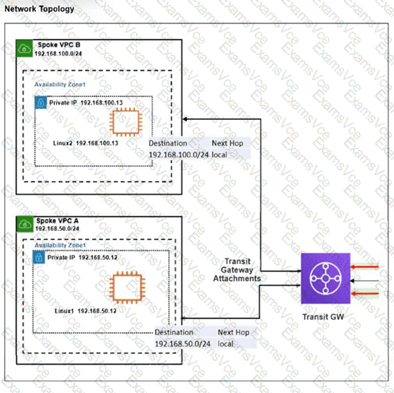 The exhibit shows a customer deployment of two Linux instances and their main routing table in Amazon Web Services (AWS). The customer also created a Transit Gateway (TGW) and two attachments. Which two steps are required to route traffic from Linux instances to the TGW? (Choose two answers)