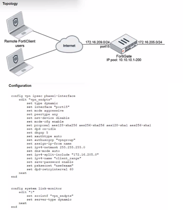 After applying the configuration shown in the configuration exhibit, the VPN clients can still connect and access the protected 172.16.205.0/24 network, but no SLA information shows up for the client tunnels when issuing the diagnose sys link-monitor tunnel all command on the FortiGate CLI.