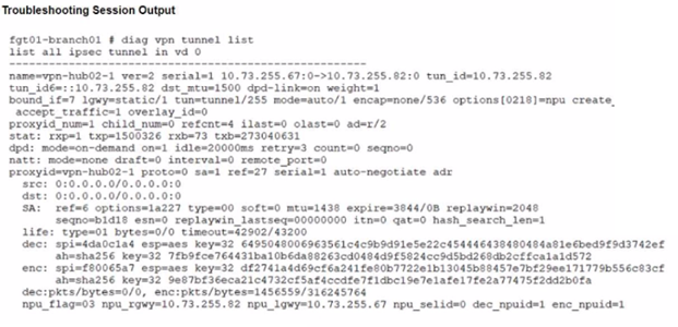 A customer is trying to restore a VPN connection configured on a FortiGate. Exhibits show output during a troubleshooting session when the VPN was working and the current baseline VPN configuration.