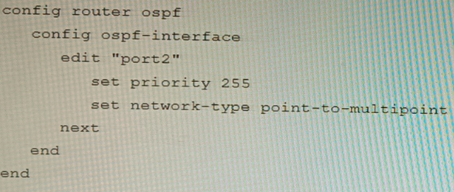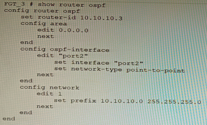 You are operating an internal network with multiple OSPF routers on the same LAN segment. FGT_3 needs to be added to the OSPF network and has the configuration shown in the exhibit. FGT_3 is not establishing any OSPF connection.
