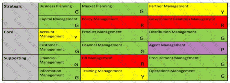 Consider the following business capability map. where cells of a model are given different colors to represent desired maturity levels (Green (G) = level achieved, yellow (Y) = one level away, red (R) =two or more levels away, purple (P) = missing capability):