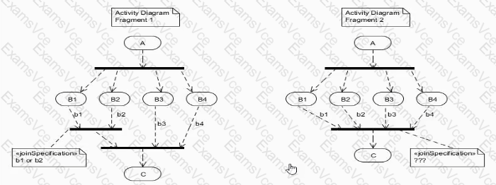 Consider the following two activity diagram fragments labeled Fragment 1 and Fragment 2. The JoinSpecification for Fragment 1 is completely specified, but the JoinSpecification for Fragment 2 is not.