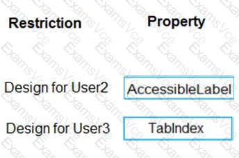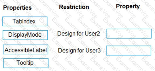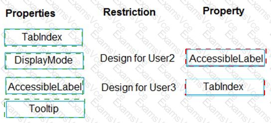 Which properties should you configure? To answer, drag the appropriate properties to the correct restrictions. Each property may be used once, more than once, or not at all. You may need to drag the split bar between panes or scroll to view content.