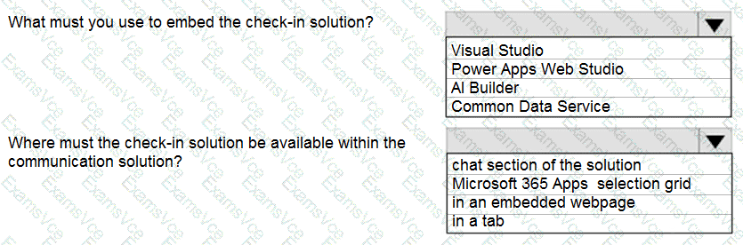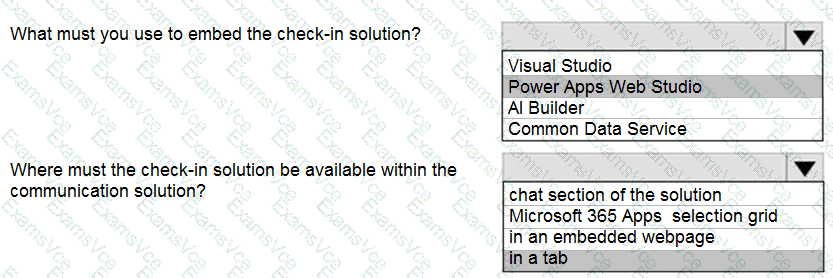You need to embed the check-in solution into the communication solution. To answer, select the appropriate options in the answer area.