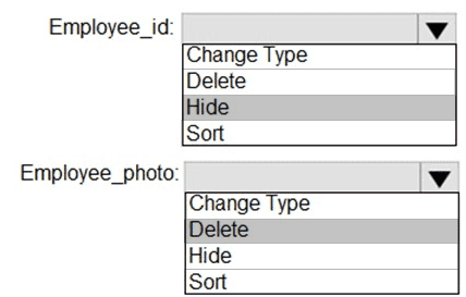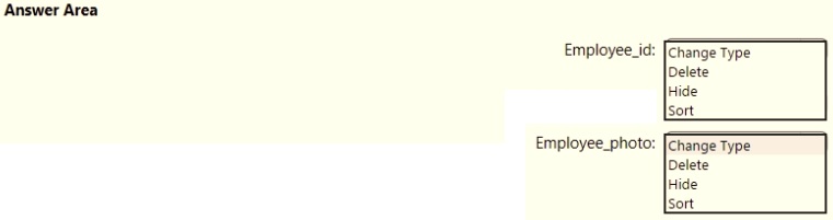 What should you configure for employeejd and employee.photo? To answer, select the appropriate options in the answer area.