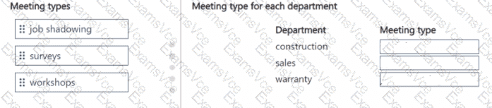 To answer, move the appropriate meeting types to the correct departments. You may use each meeting type once, more than once, or not at all. You may need to move the split bar between panes or scroll to view content.