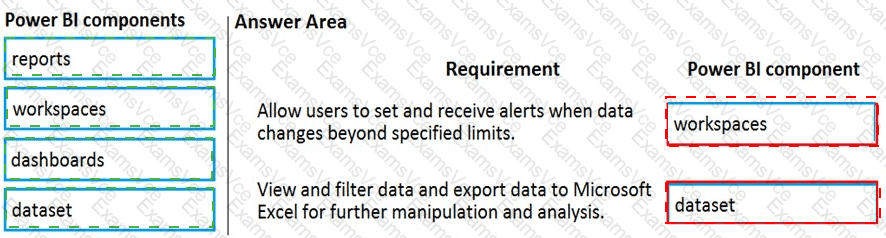 Which Power BI components should the company use? To answer, drag the appropriate Power BI components to the correct requirements. Each Power BI component may be used once, more than once, or not at all. You may need to drag the split bar between panes or scroll to view content.