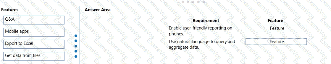 Match each Power Bl feature to its requirement. To answer, drag the appropriate features from the column on the left to its requirement on the right. Each option may be used once, more than once, or not at all.